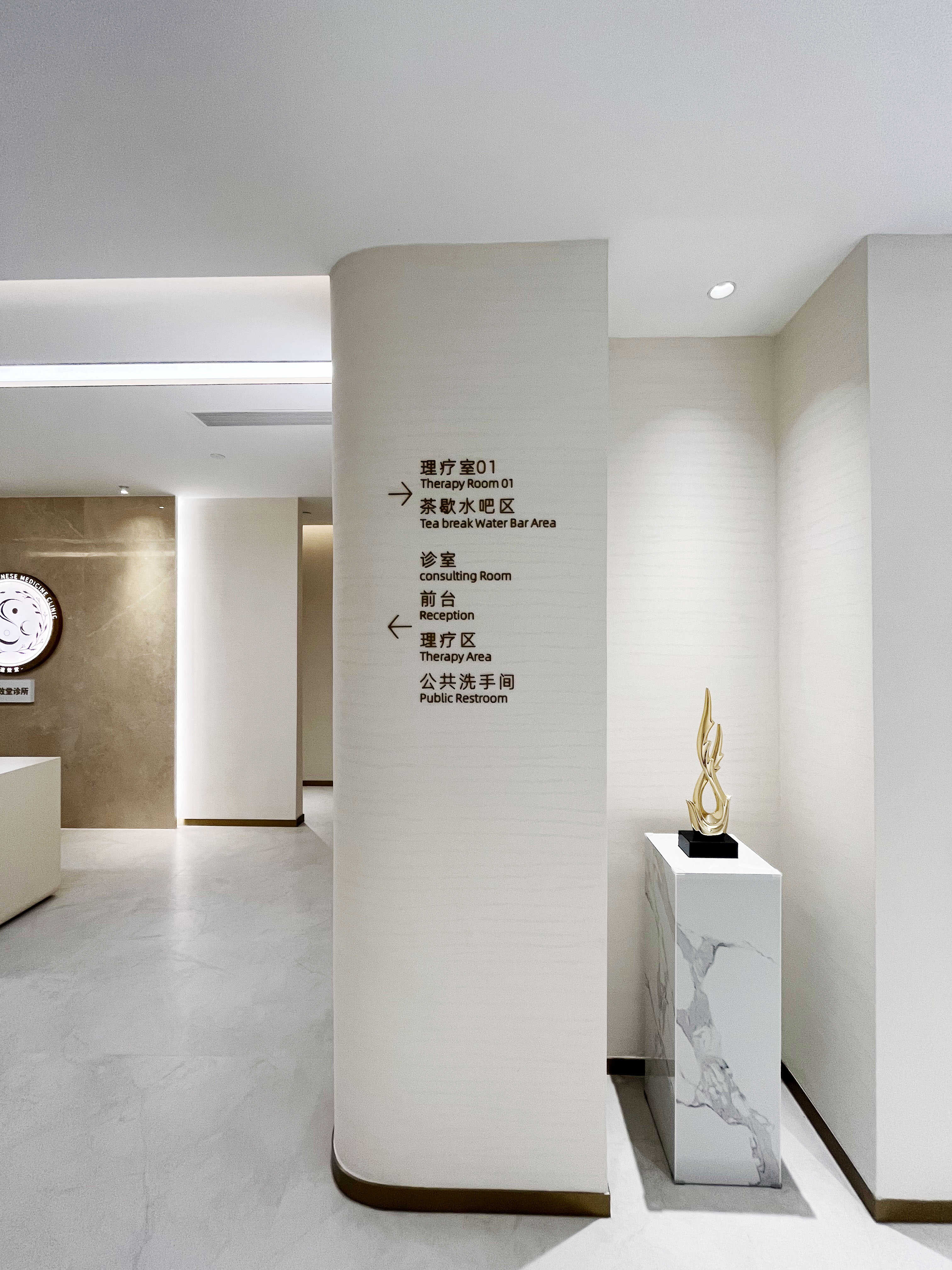 项目介绍:以简约米白石头纹艺术漆与温润木色为基调,借古铜金线条进行几何形体划分空间,融合清晰导视与艺术陈设,营造简洁、舒适且具人文温度的现代中医养生空间 。