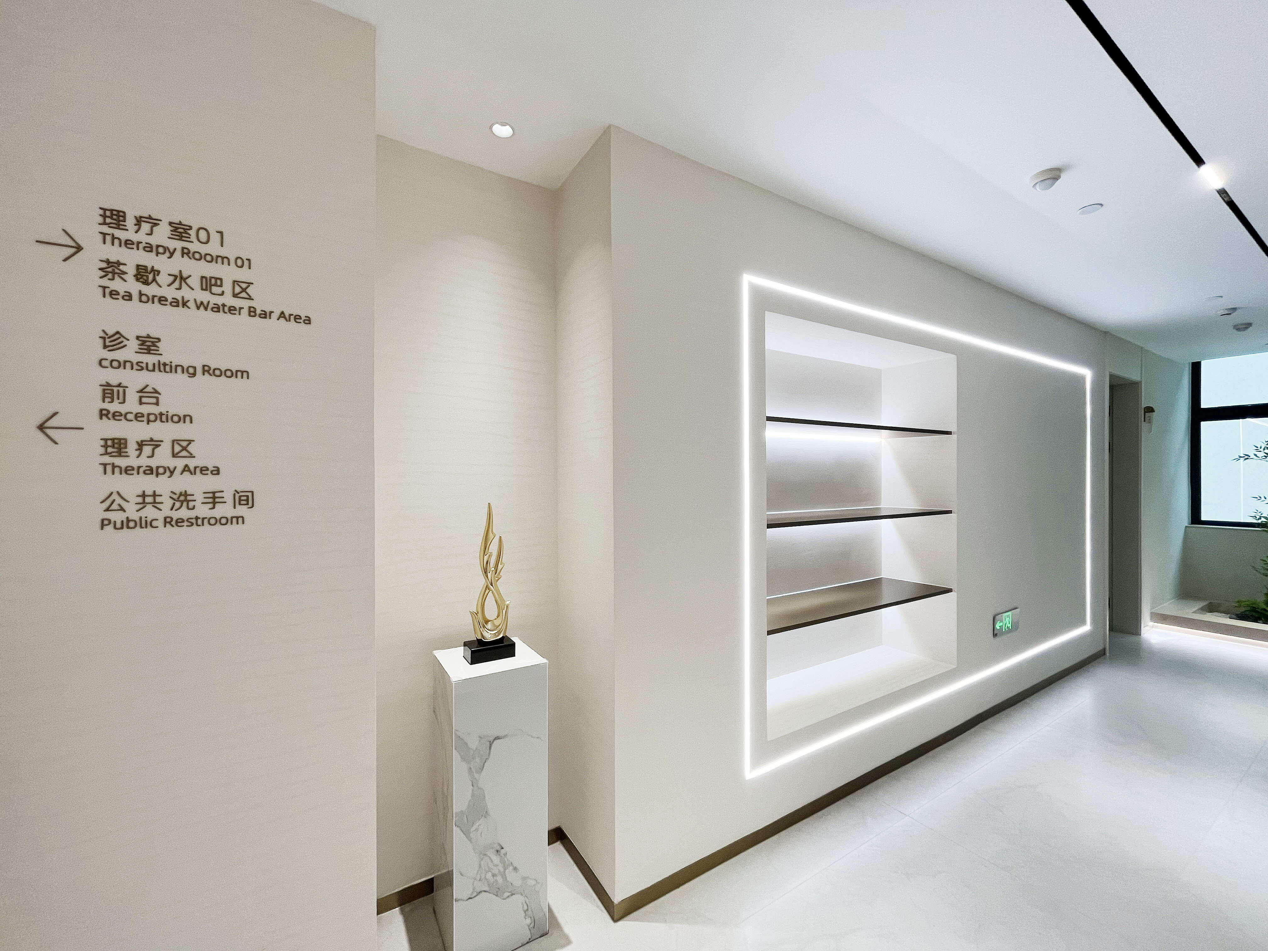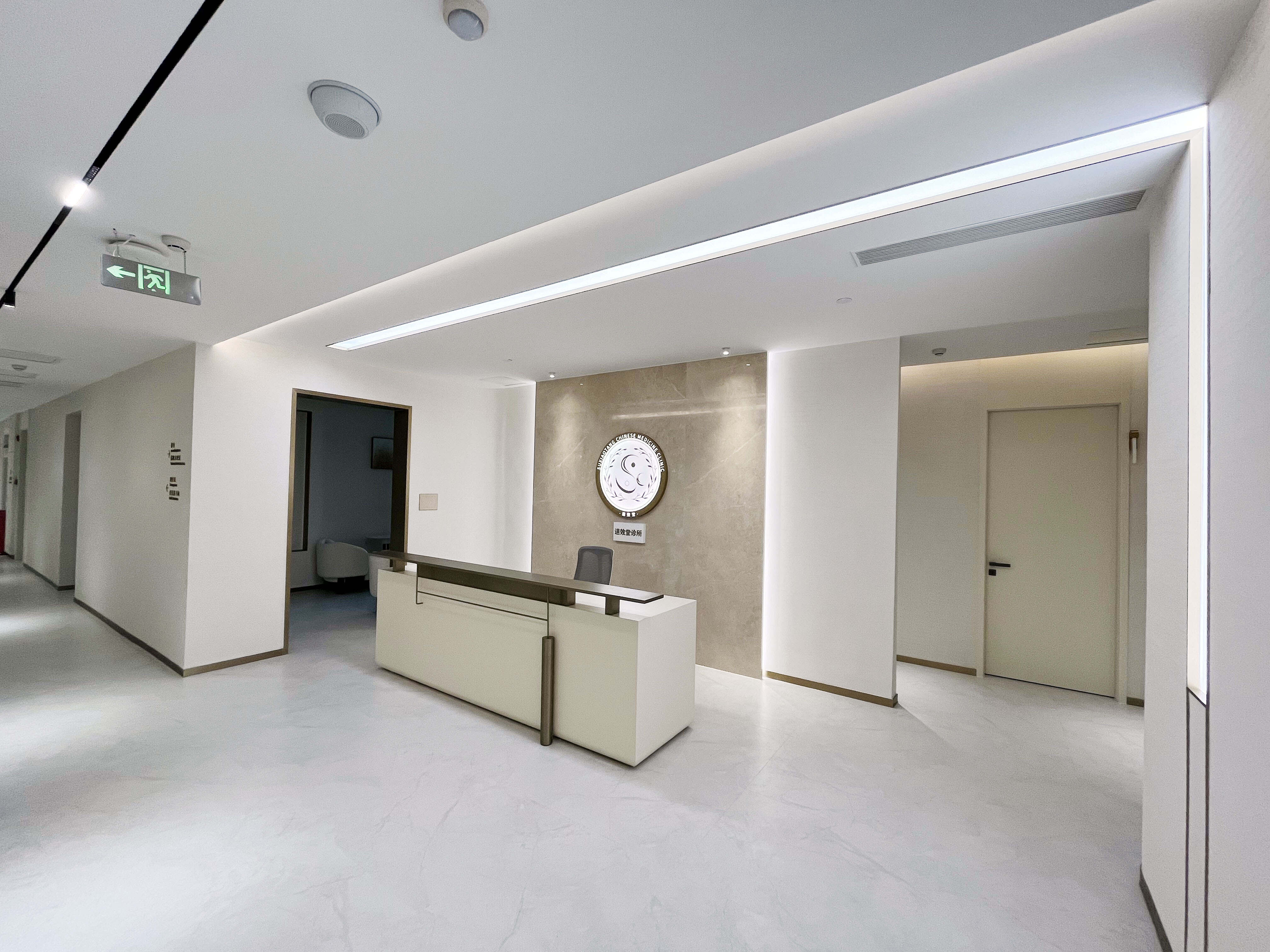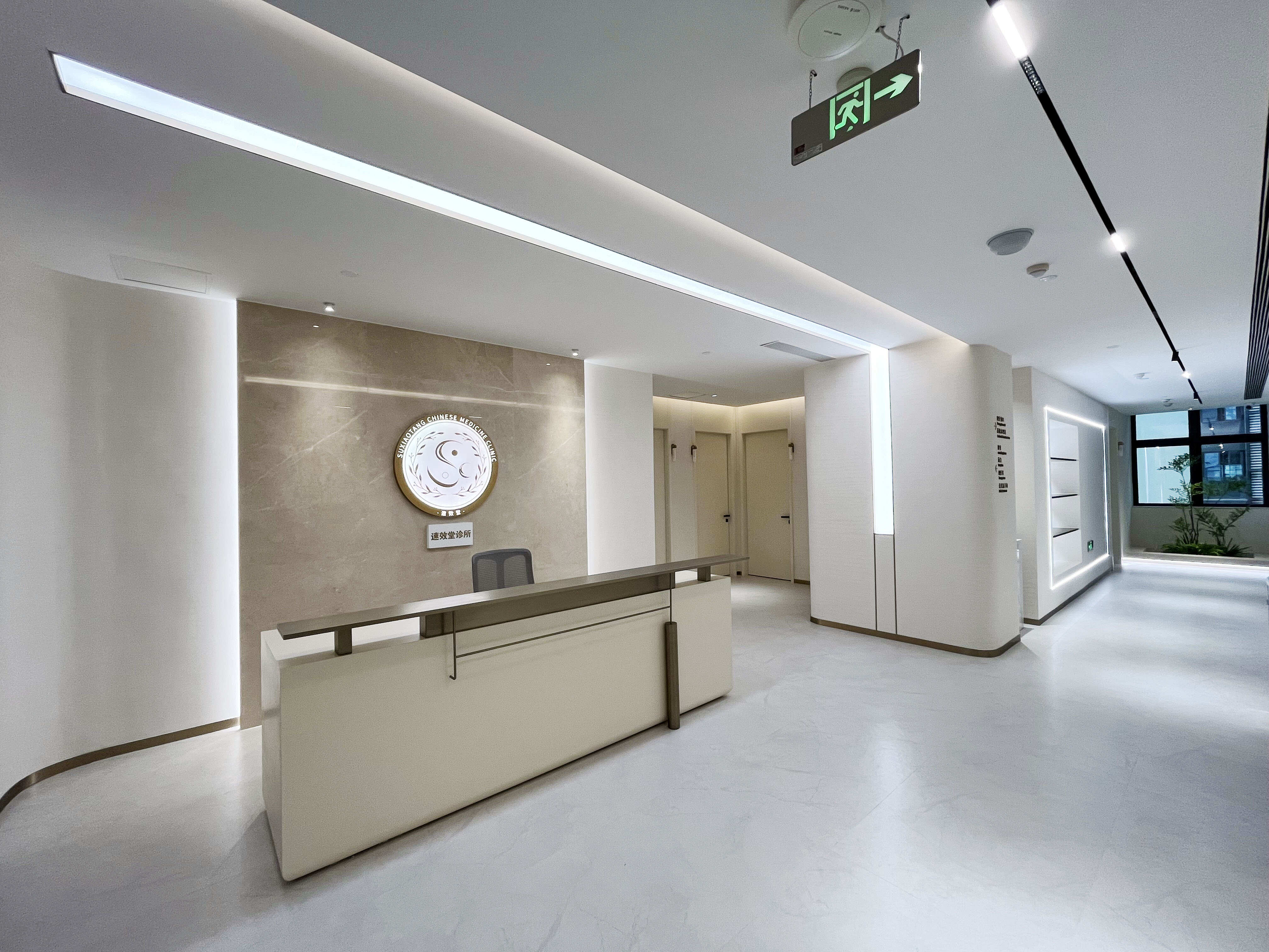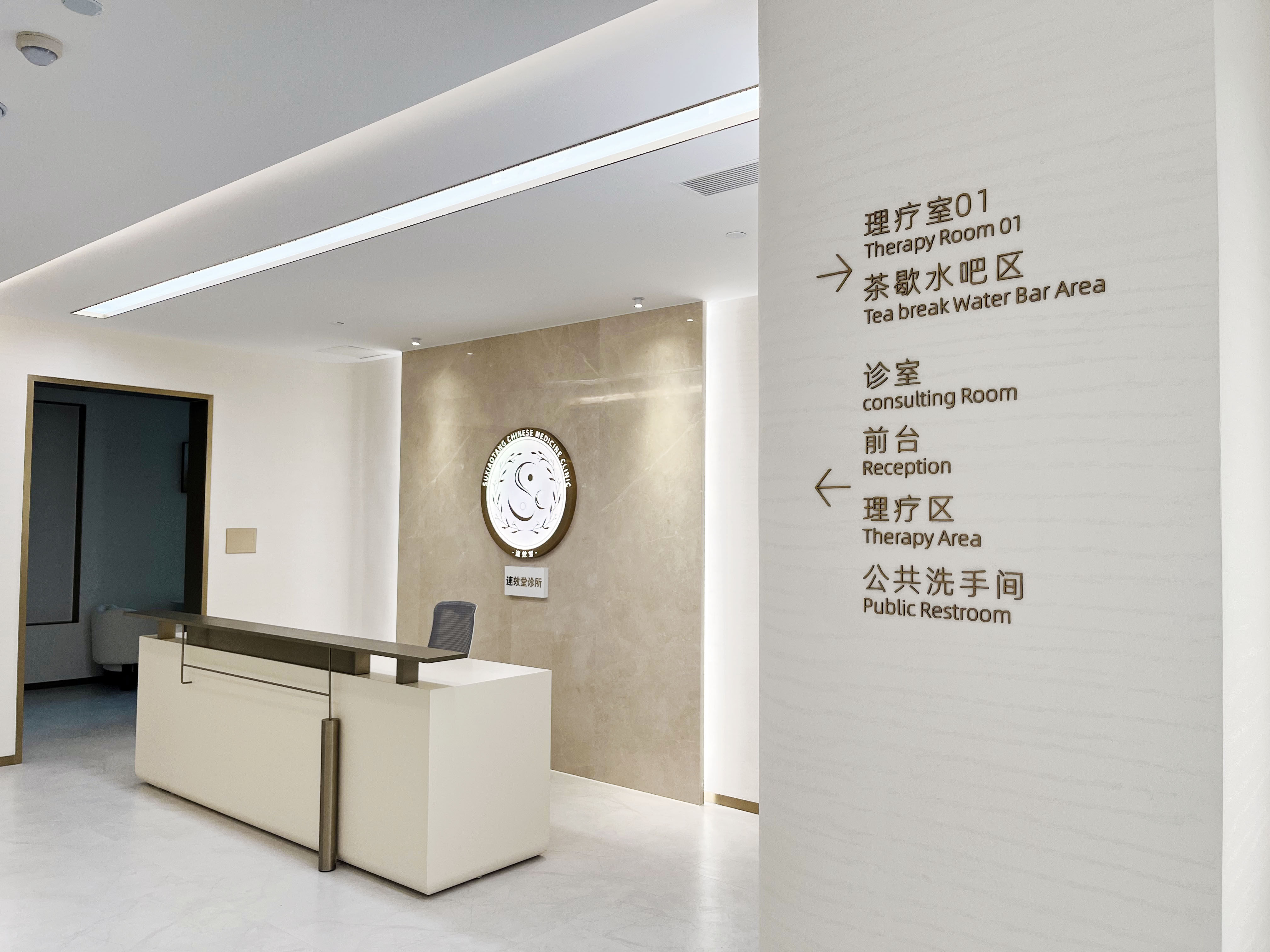 项目介绍:以简约米白石头纹艺术漆与温润木色为基调,借古铜金线条进行几何形体划分空间,融合清晰导视与艺术陈设,营造简洁、舒适且具人文温度的现代中医养生空间 。