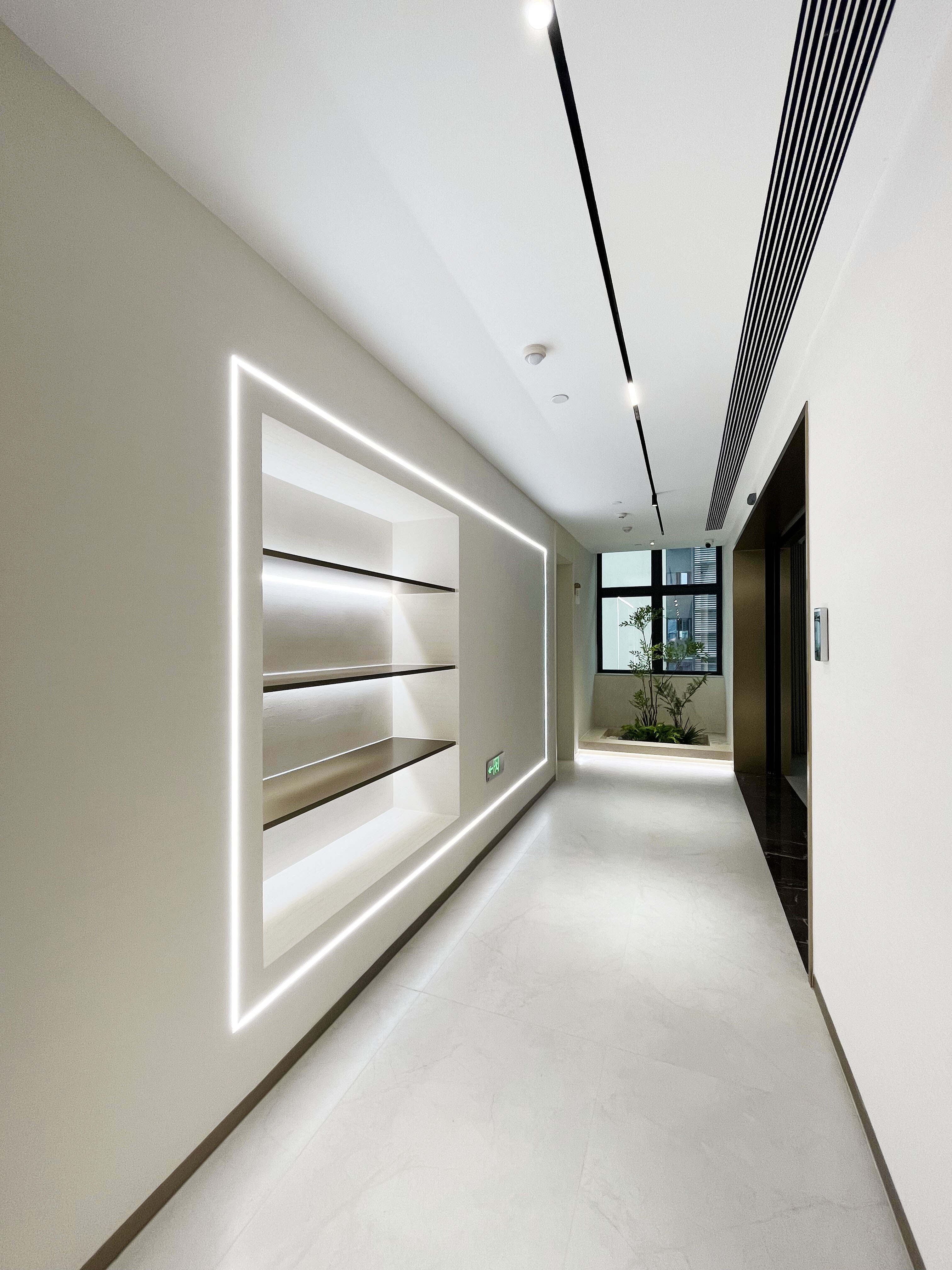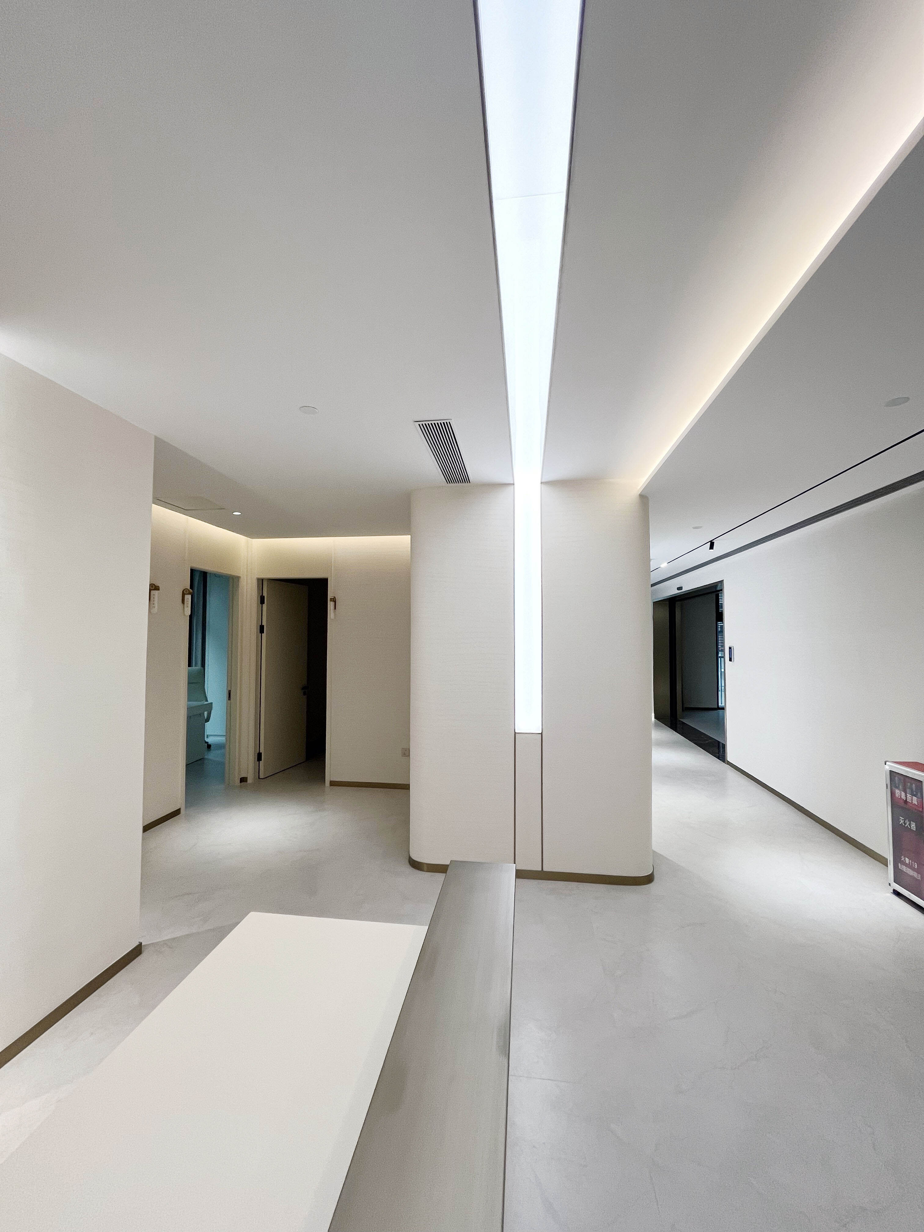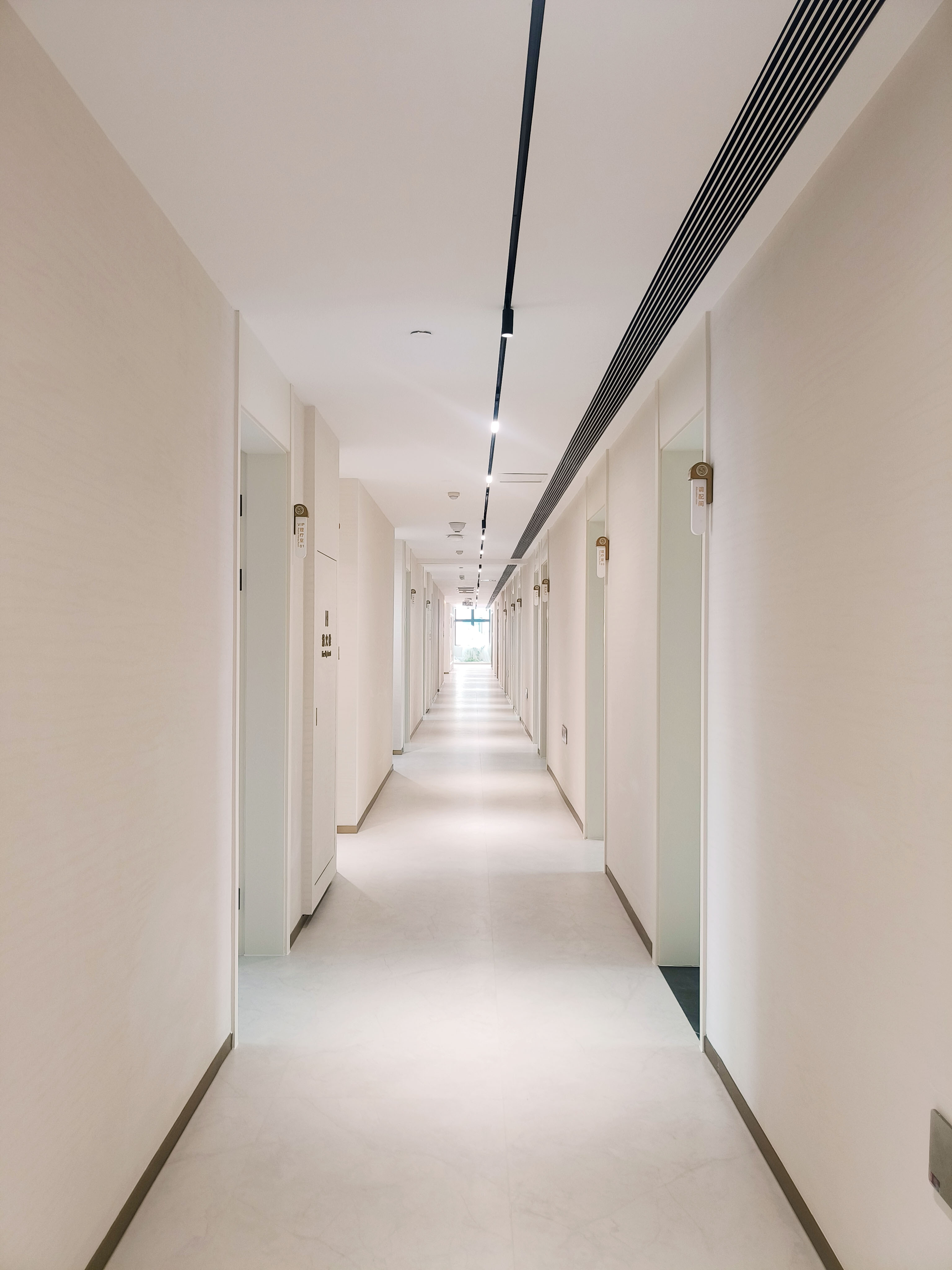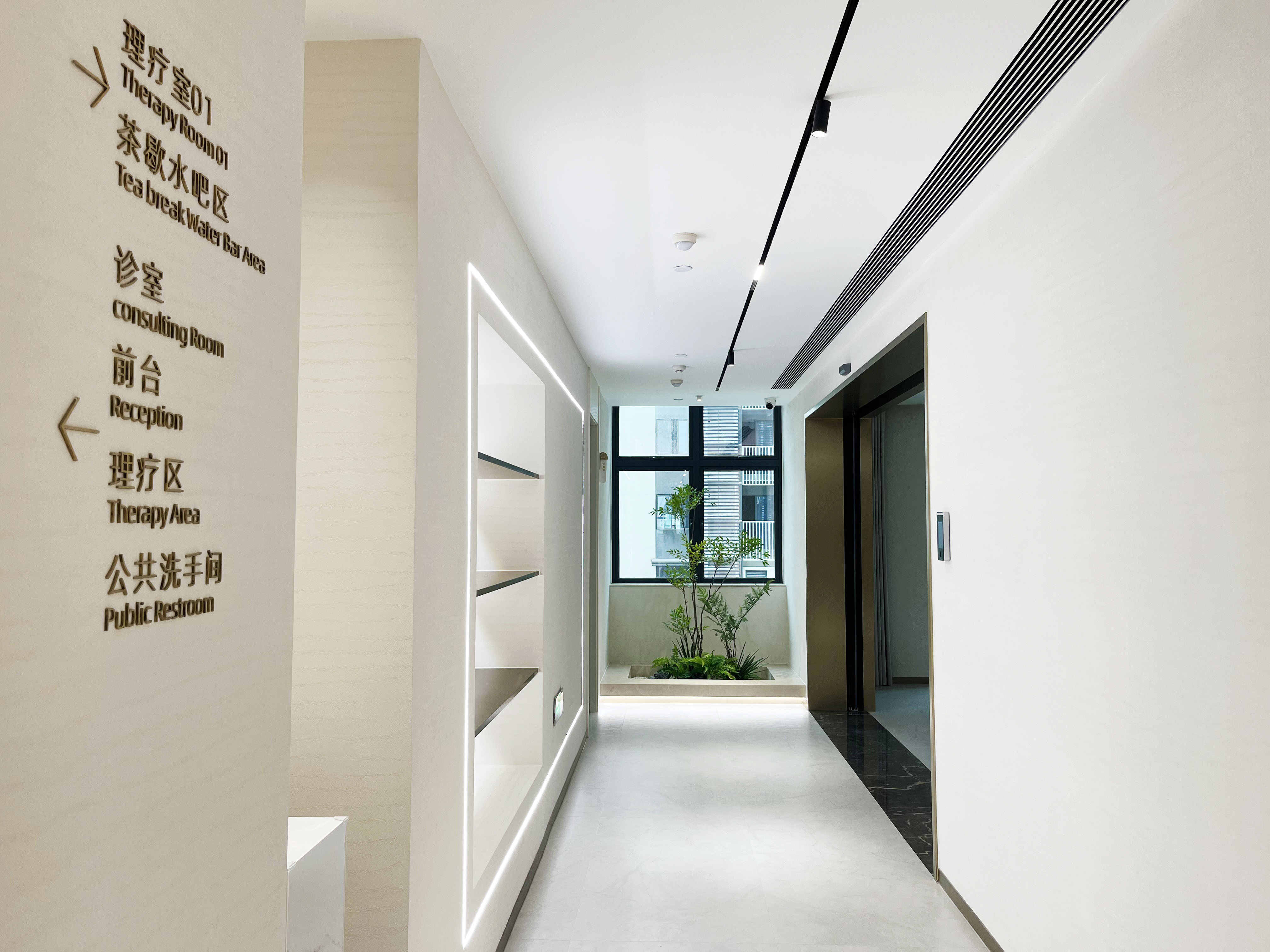项目介绍:以简约米白石头纹艺术漆与温润木色为基调,借古铜金线条进行几何形体划分空间,融合清晰导视与艺术陈设,营造简洁、舒适且具人文温度的现代中医养生空间 。