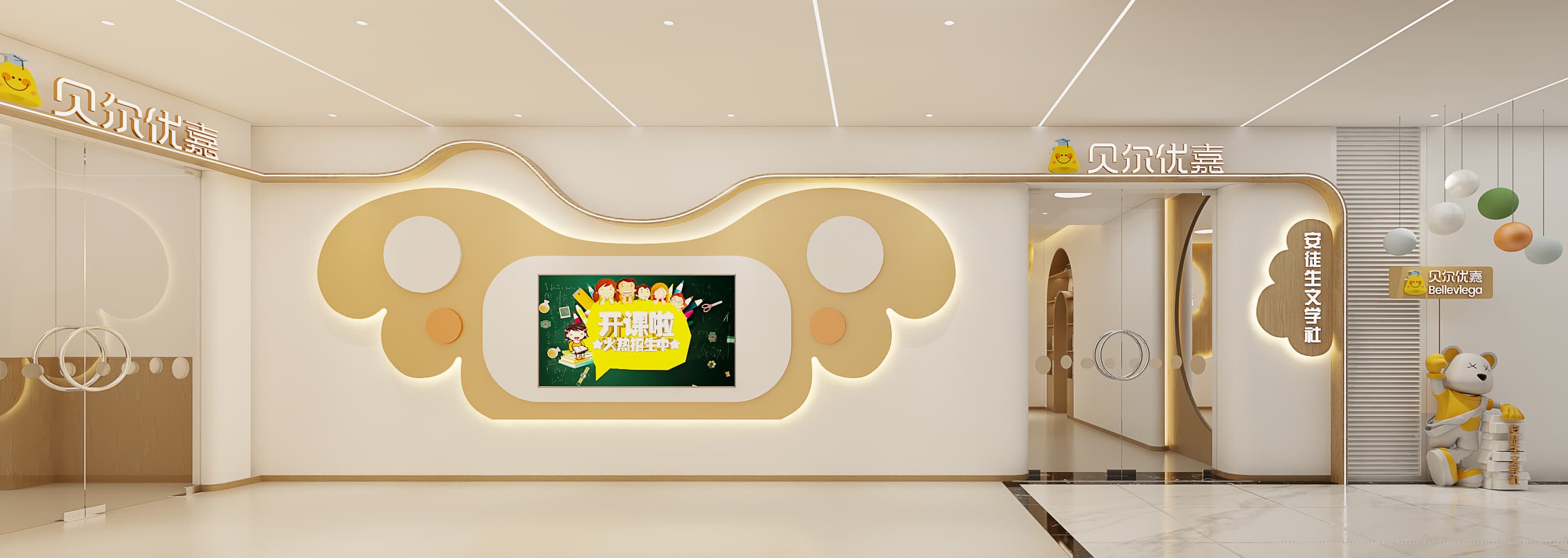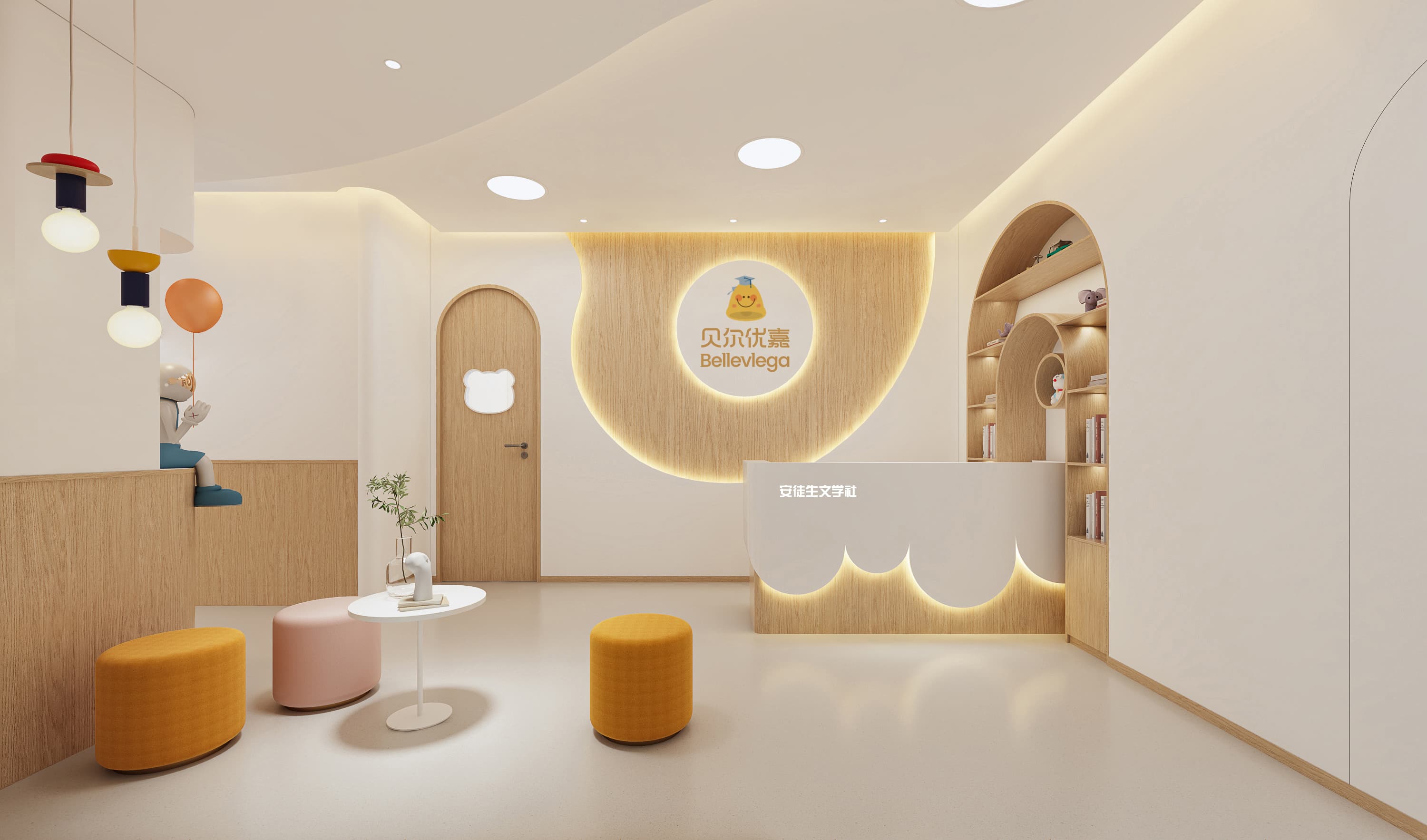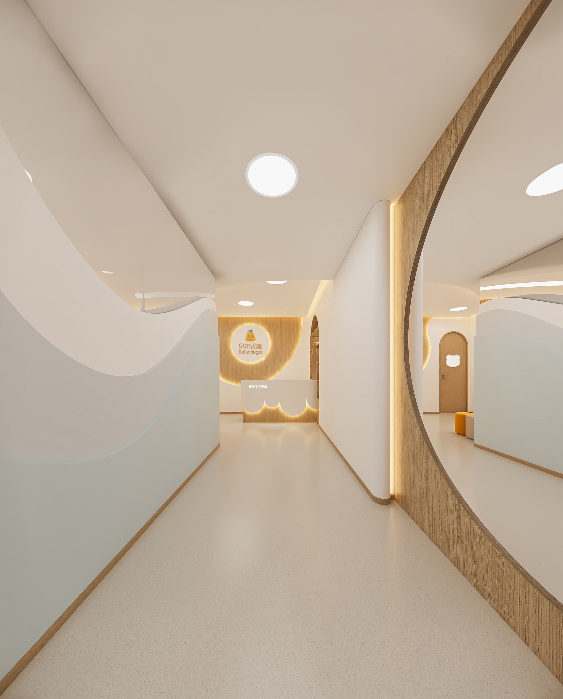 通过 统一视觉符号(如 “贝尔优嘉” 标志重复出现、品牌色融入软装),加深品牌印象;同时,用温馨、童趣的空间语言诠释品牌 “关爱儿童成长” 的理念,让空间成为品牌文化的直观载体,传递专业、亲和的品牌形象。