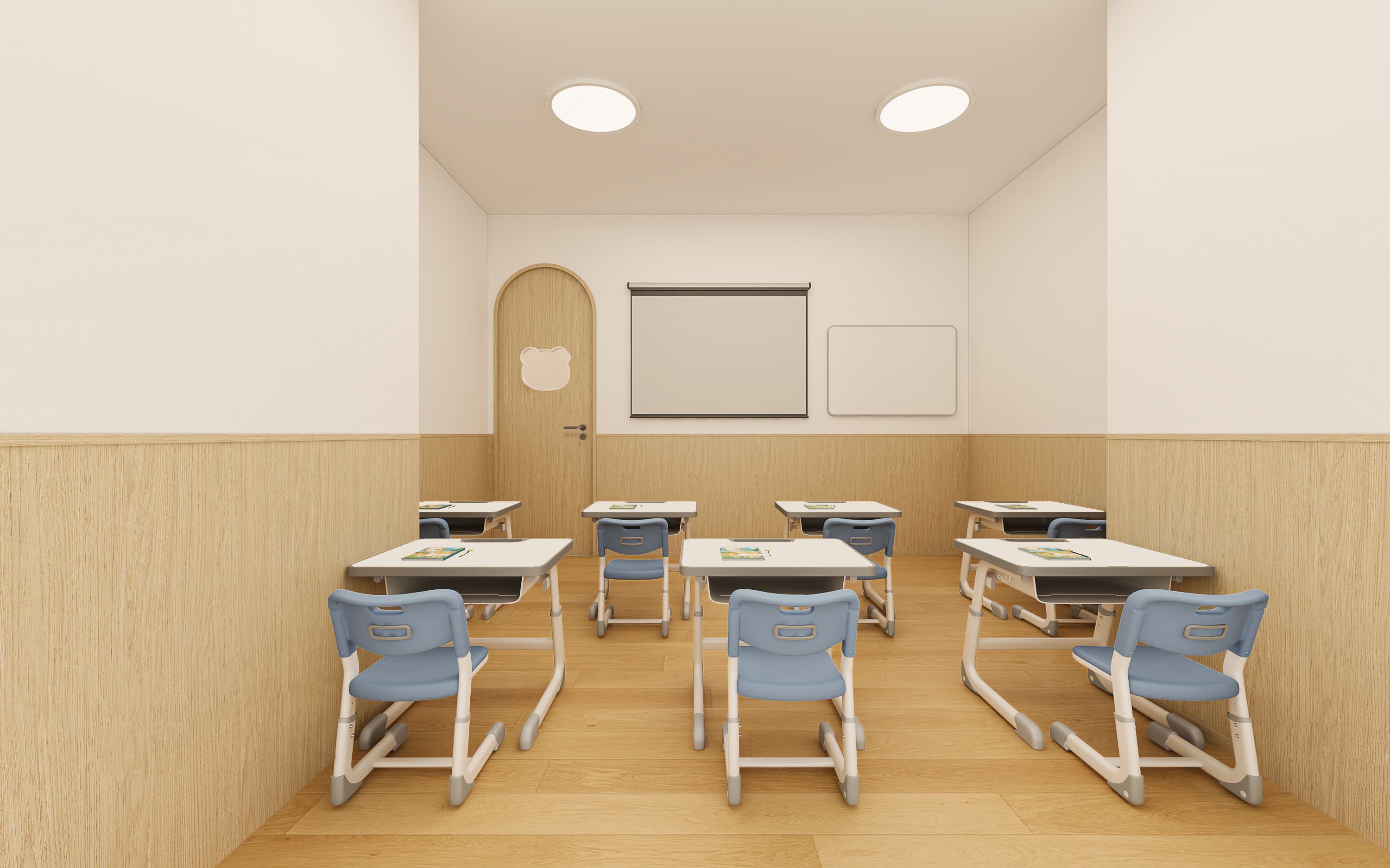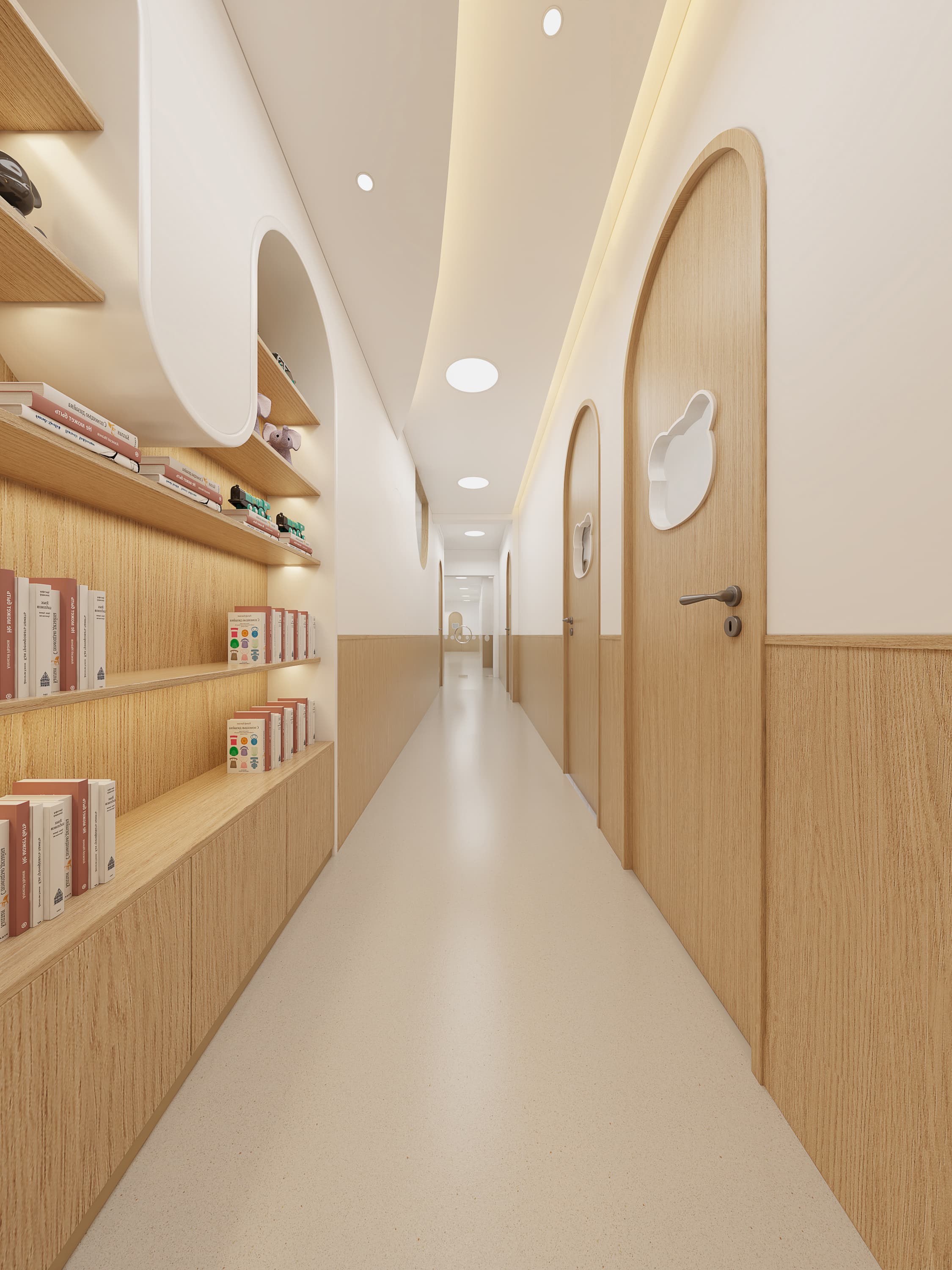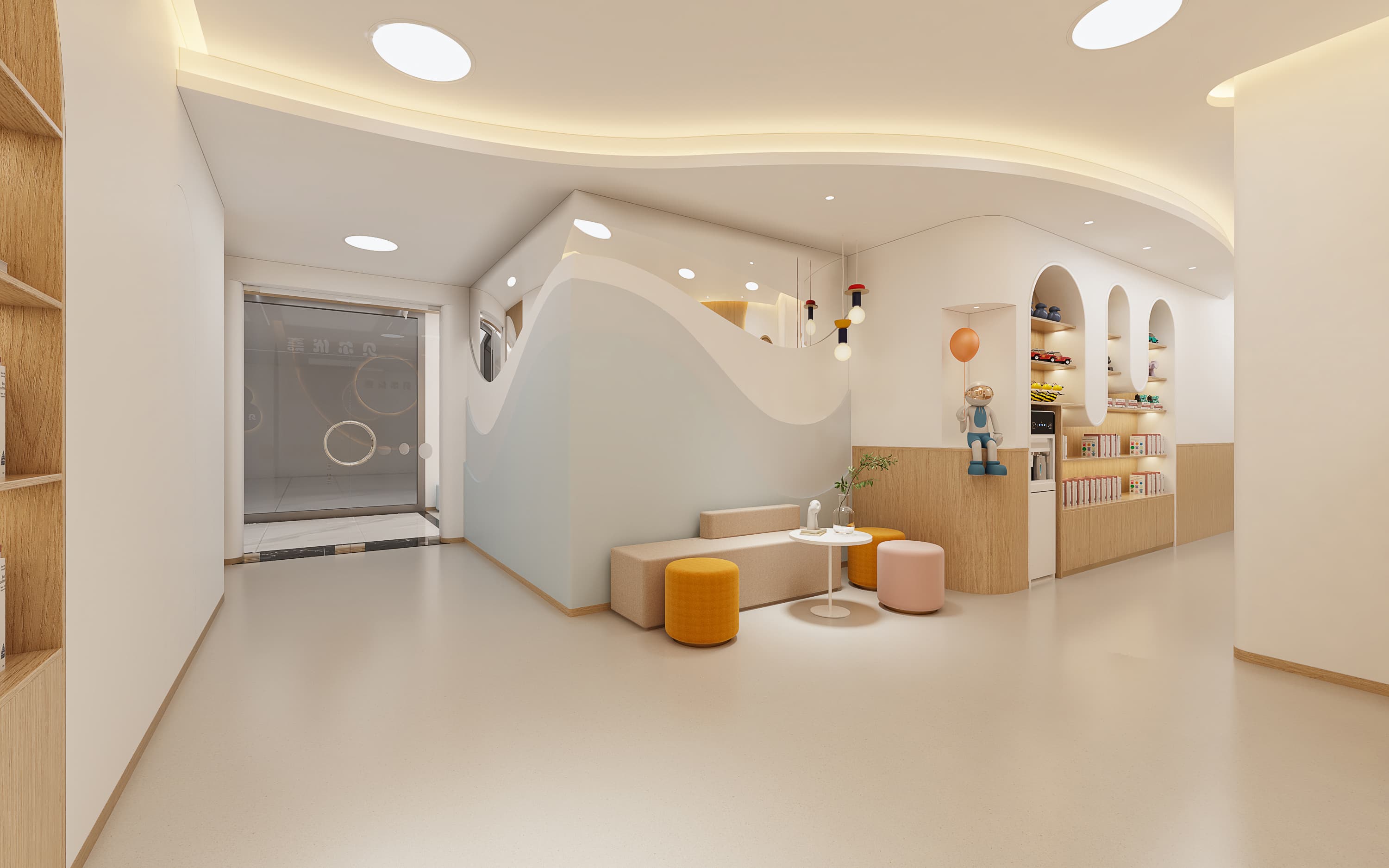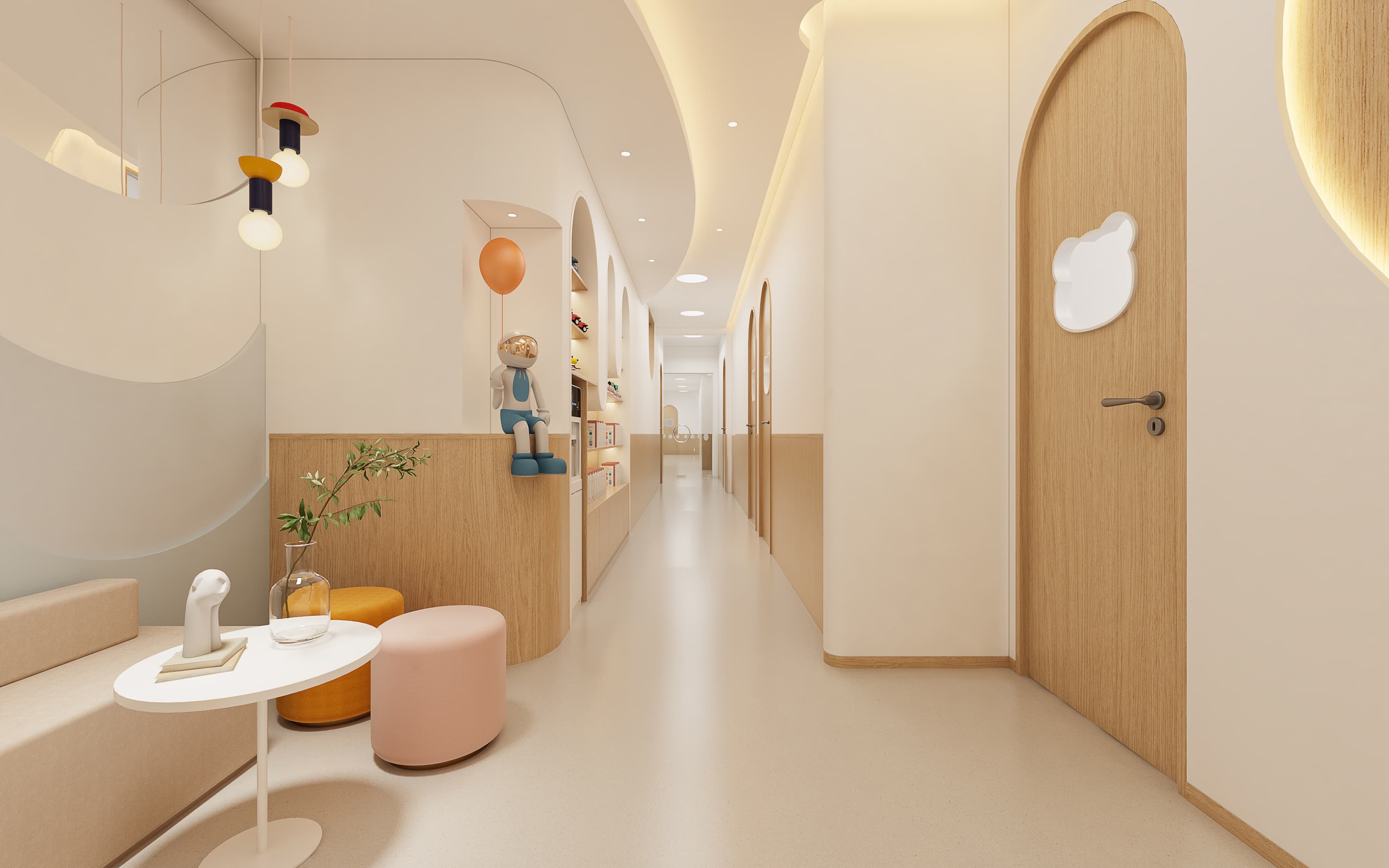 以 柔和色调(米白、浅木色为主)构建温暖基底,搭配弧形元素(拱门、波浪隔断),弱化尖锐边角,既契合儿童对 “圆润、柔和” 的视觉偏好,也降低磕碰风险,传递安全、亲切的心理感受,让孩子轻松融入环境。