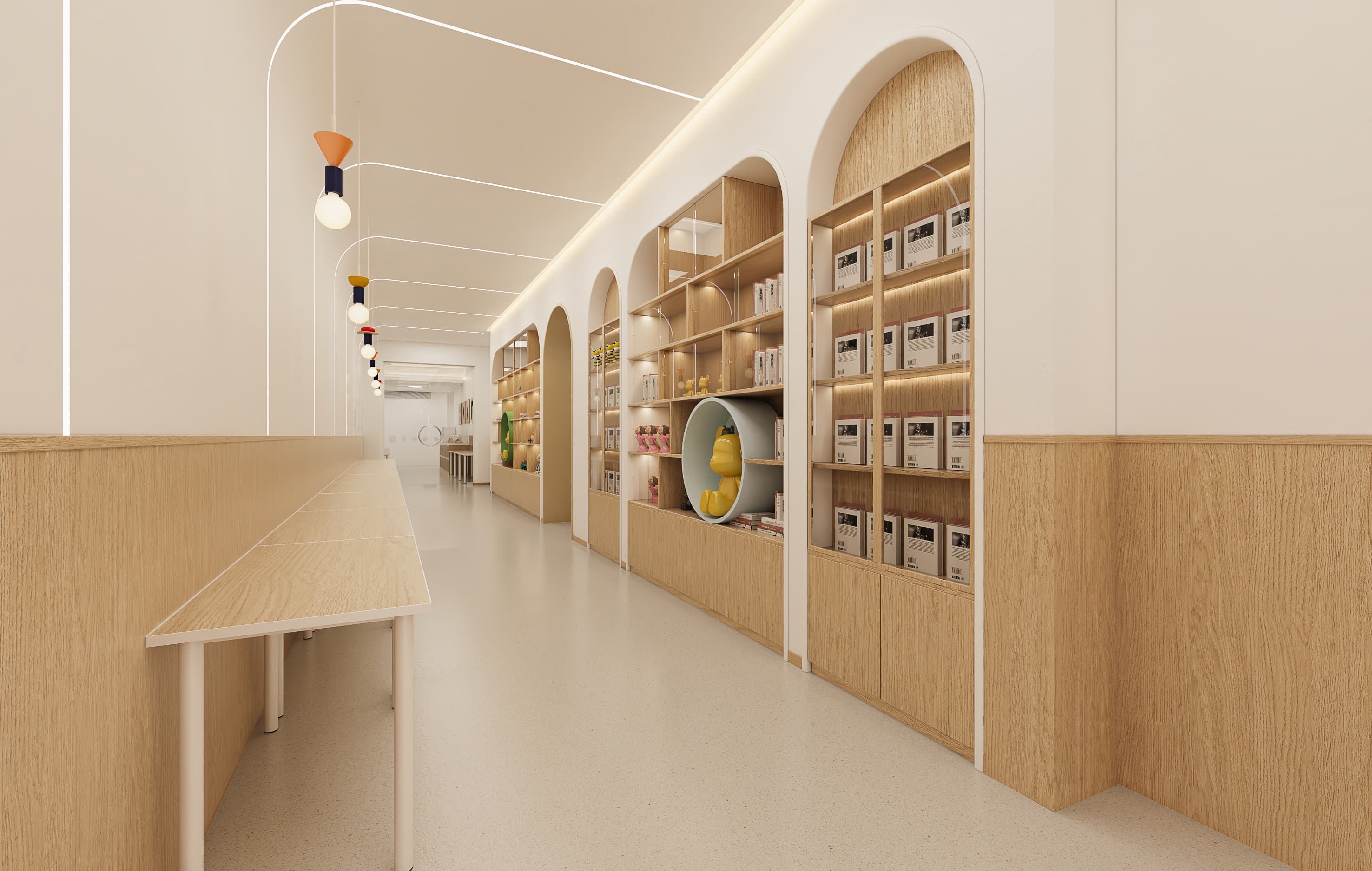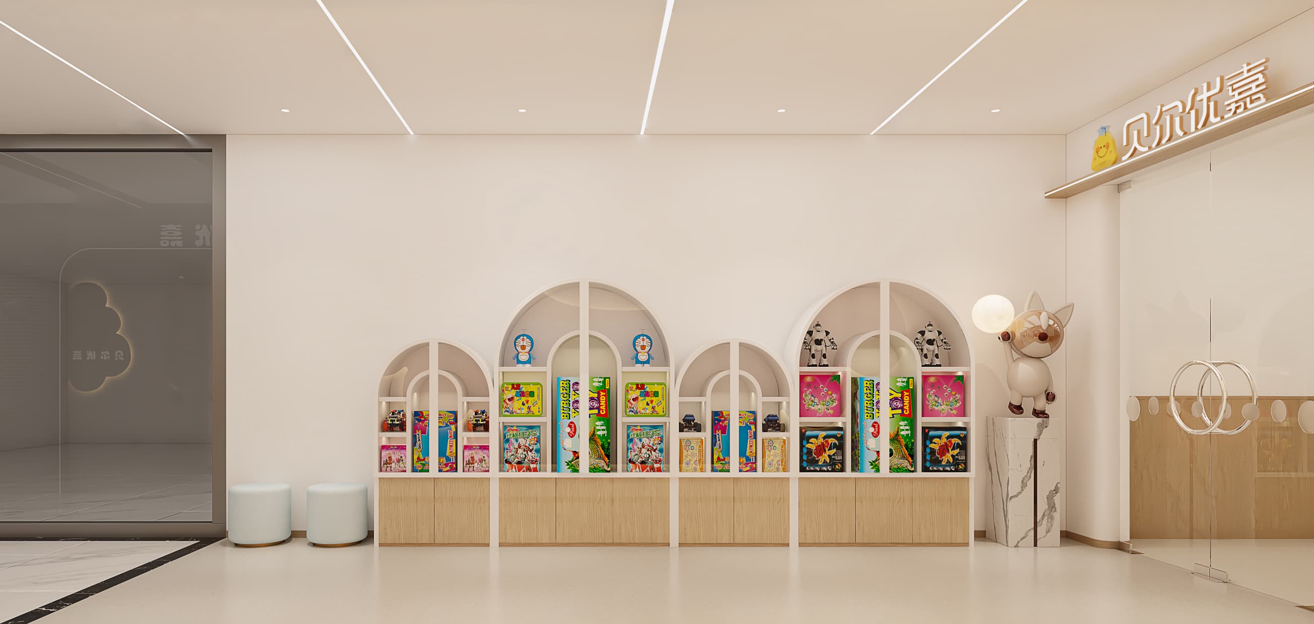 展示区(如玩具陈列墙):用拱门造型打造视觉焦点,陈列多彩玩具、绘本,既满足儿童 “探索欲”,也可作为环境教育素材,激发认知兴趣;